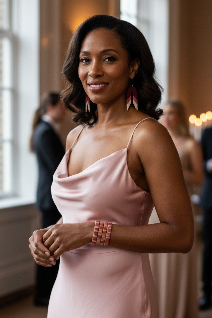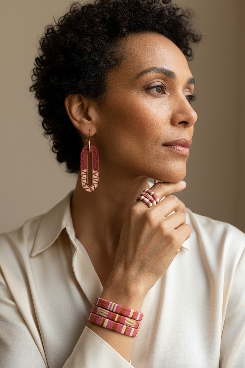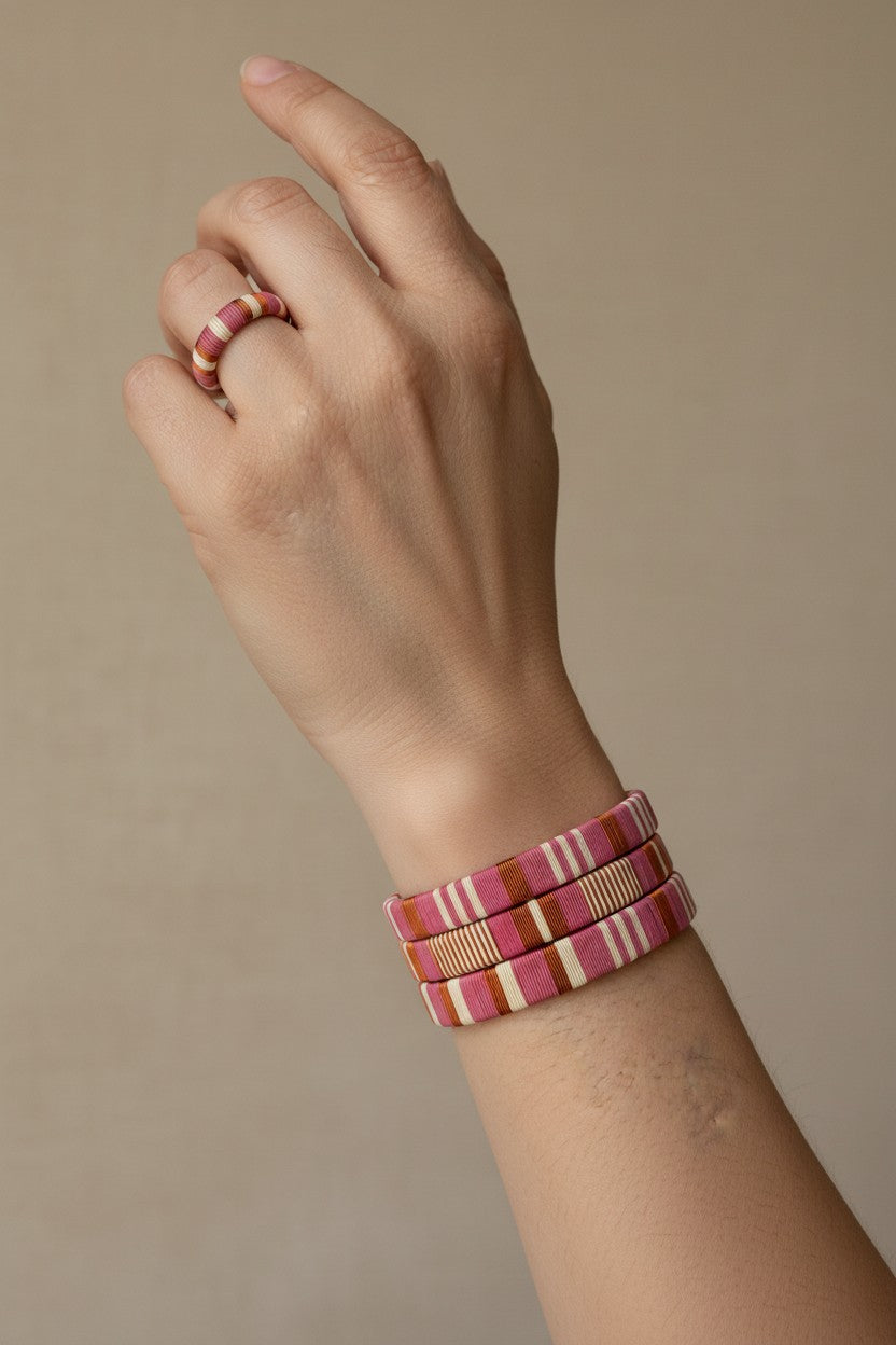 Stylish and elegant bracelets designed to complement your TAVWE earrings. Each bracelet is composed of copper craft wire and fine palm leaf threads wrapped around pvc and finished with soft felted ends. These bracelets fit sizes Sm to Med wrists. They can be opened to allow for the wrist to slide through the side. Handcrafted by award-winning Wounaan artisans internally displaced in Colombia. The palm leaf is sustainably harvested from the rainforests of Colombia's Pacific coast.